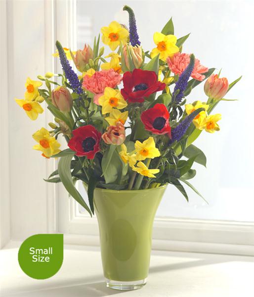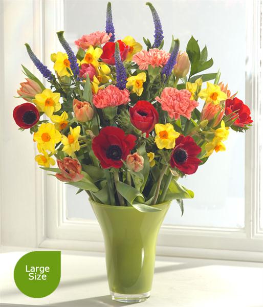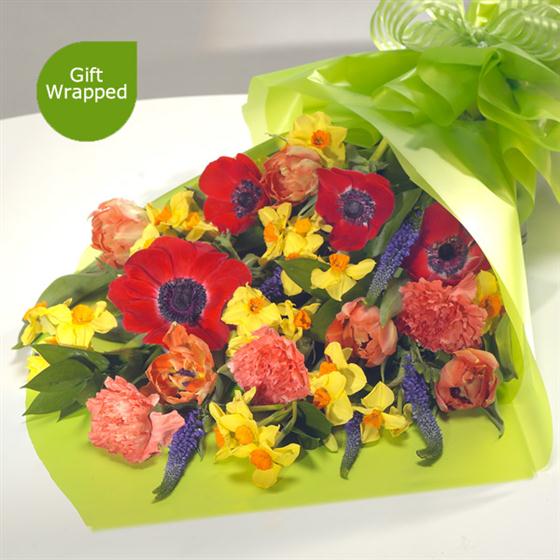 A fantastically bright and simply stunning spring flower bouquet. Rich red Anemone have been perfectly married with sunshine yellow Paperwhite Narcissi and striking purple Veronica. Orange Tulips and Carnations complete the arrangement. This selection of spring stems - when in season has always been one of our best sellers that is great value and always well received too .