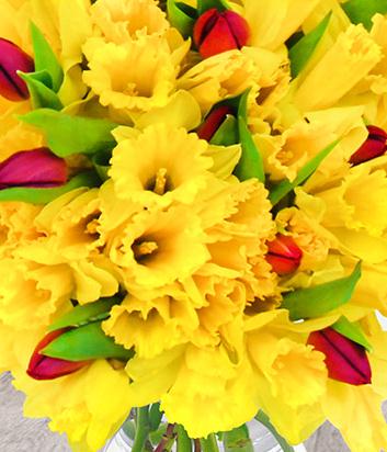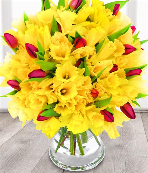 A gloriously bright 100 stemmed spring flower bouquet, featuring 90 daffodils and 10 tulips grown in the UK.
