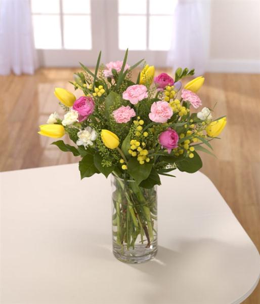 It's a pastel bonanza Spring bouquet! From yellow Tulips to pink Ranunculus and Mimosa. From our value for money gift box range that arrives in water and a practical standing card vase display .