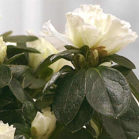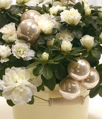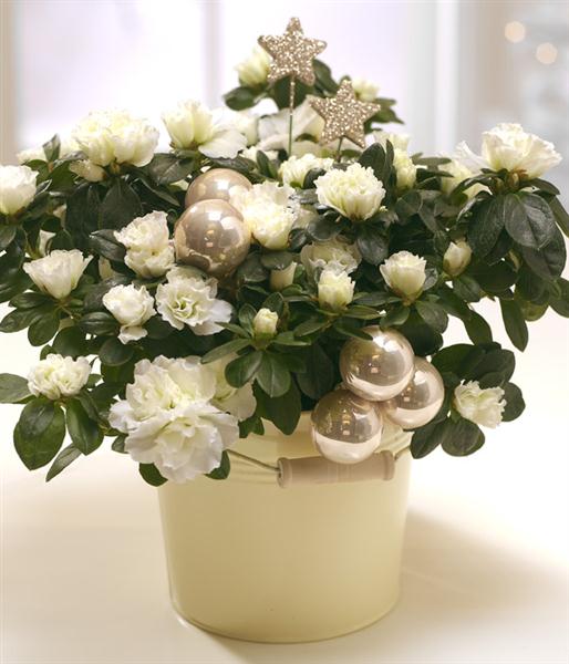 A beautiful white Azalea plant decorated with champagne coloured glitter stars and baubles. A simple but stunning Christmas flower gift presented in a cream zinc bucket.