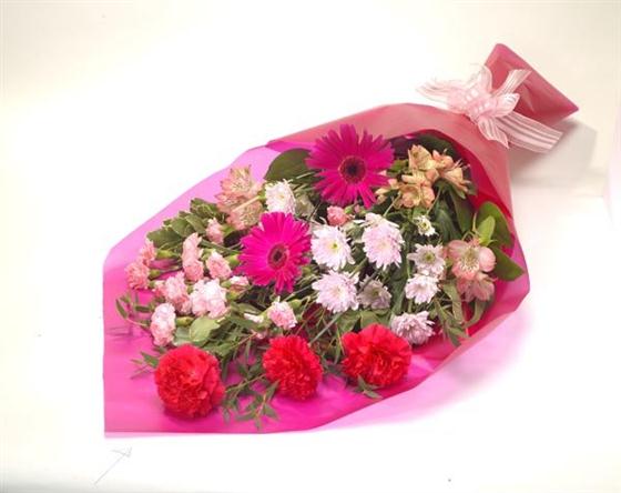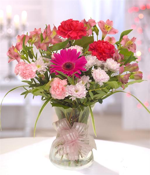 A soft and sultry bouquet of delicate and deep pinks. Cerise Gerberas and Carnations contrast well with the softer shades of Alstroemeria, spray Chrysanthemums and spray Carnations. Vases from our modern glassware selection are available to add to your gift .