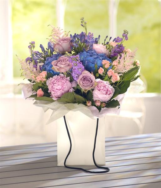 Get a WOW with this delightfully fragrant gift bag collection of hydraneas, agapnthus, roses, peonies and stocks.Using all of summers most popular flower varieties .