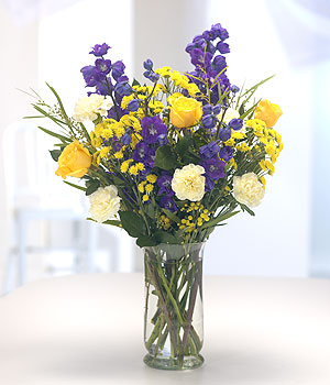 The Perfect gift - a beautifully packaged bouquet of vibrant yellow & blue flowers. Your gift will arrive in a water bombe and presentation box . A vase from our fine glassware section can be added as the perfect accompaniment to your gift .