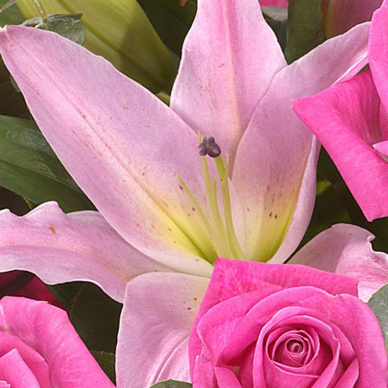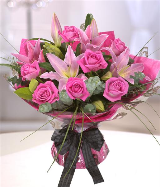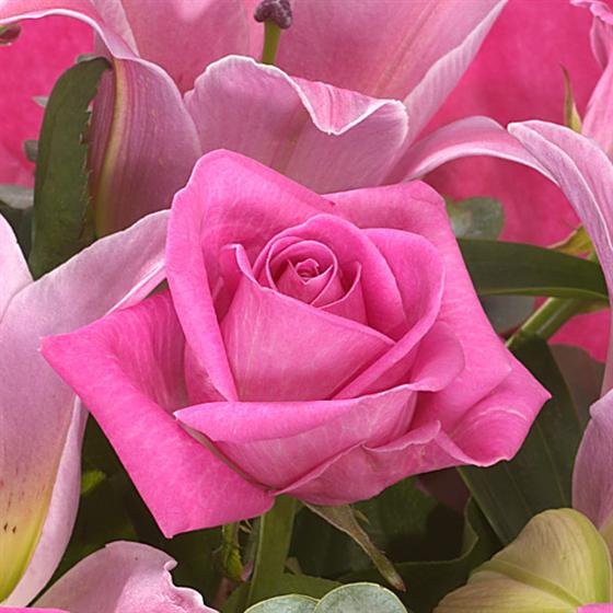 6 pink Roses and Lilies with eucalyptus abd bear grass for somebody special, this pretty aqua pack will melt her heart.
