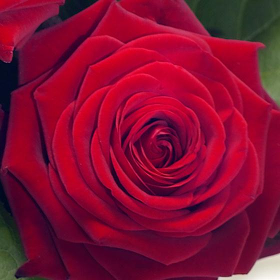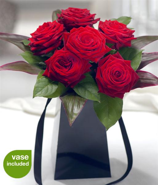 Quite simply 6 gorgeous, velvety red Roses in a high gloss, black flower gift vase. A romantic gift.