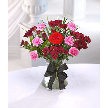 Deep red Chrysanthemums, pretty pink Carnations and a bright red Rose. Vases from our range of modern glassware can be added to compliment your gift . Your gift will be arranged in a water bombe and presentation gift box .