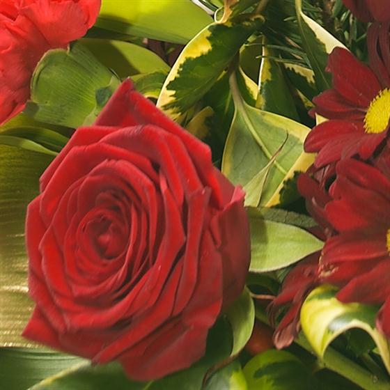 A sumptuous Christmas aqua pack bouquet featuring velvety red Roses, ruby red Carnations and deep red spray Carnations. A flourish of variegated Holly and sprinkling of golden baubles complete the design.