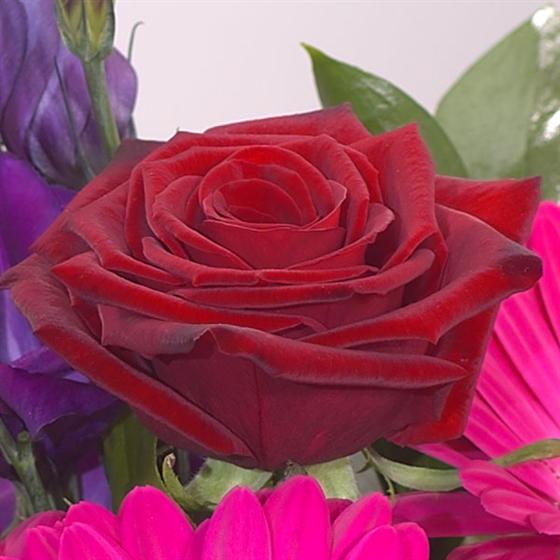 A hot and passionate arrangement of flowers and foliage arranged in a vase, includes a single red Rose.