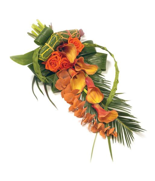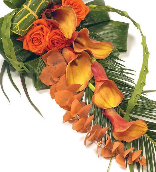 A modern and ecclectic design featuring Calla lily and rose sheaf in shades of orange.