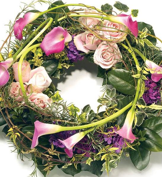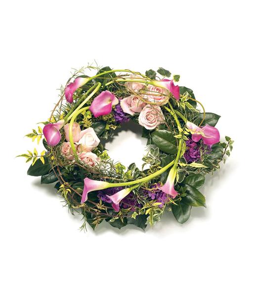 Stunning open round wreath in shades of pink and purple, including Calla Lilies, Roses, Hydrangea and complementary foliage. We recommend the purchase of a stand for the 2 larger size wreaths which range from £10.00 to £20.00 . Please call 01923605014 for further advice .