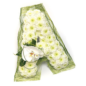 Based letter with Abaca ribbon edging and white Orchid spray. Size: Height - 31cm (12").