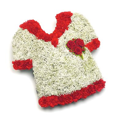 Football shirt made from Carnations, Roses and Gypsophila. Size: Base - 54cm (21") Height - 54cm (21").
