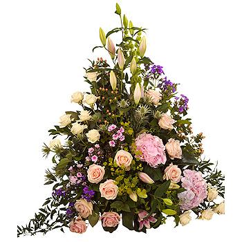 A luxurious pastel arrangement featuring pink and cream Roses, pink and purple Phlox, pink Lilies and Hydrangea with a generous array of foliage.