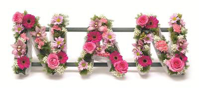 Loose based letters on stand, including exotic Orchids, Roses, Gerberas, Chrysanthemums and complementary ribbon edging. Size: Height - 28cm (11") Length - 80cm (31").