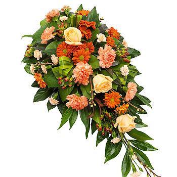 A beautiful orange and peach single ended spray. Roses, Chrysanthemums, Carnations and bronze Hypericum sit perfectly alongside variegated red and lime Dracaena, Aralia leaves, Cocculus, Salal and Cherry Blossom.Every one of our stunning funeral tributes will be lovingly hand created. To ensure the flowers remain fresh and in the best possible condition we will deliver your tributes hydrated to keep them in pristine condition. Standard size is 2ft .