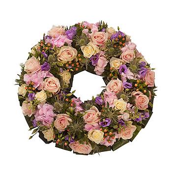 A modern , sophisticated and pretty pastel wreath using pink and cream Roses, pink Hydrangea and Hypericum are mixed with purple Lisianthus and white Eryngium and also using Aspidistra leaves as foliage .This design can also be created incorporating exotic Cymbidium orchids . We recommend the purchase of a stand for the 3 larger size wreaths which range from £10.00 to £20.00 . Please call 01923605014 for further advice when ordering this item.