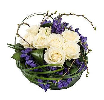 A stunning modern posy pad of white and cream Roses neatly nestled with purple Aconitum or Hyacinths if in season , Aspidistra leaves and Lily grass foliage complete the design. Very striking and a real head turner . Ideal for male family members and friends but also can work very well for a lady .