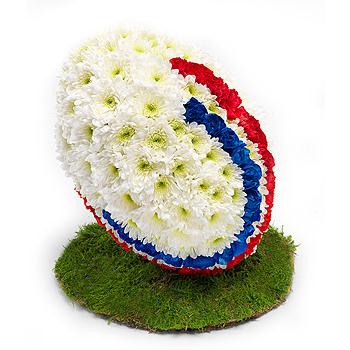 A 3D rugby ball tribute created using white spray Chrysanthemums, red and white spray Carnations and Moss.