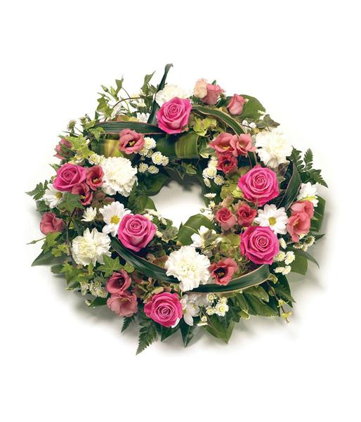 Open round wreath includes Roses, Carnations, Eustoma, Chrysanthemums with natural foliage edge.Ideal choice for a much loved female member of the family or friend. We recommend the purchase of a stand for the 2 larger size wreaths which is £15.00 . Please call 01923605014 for further advice.