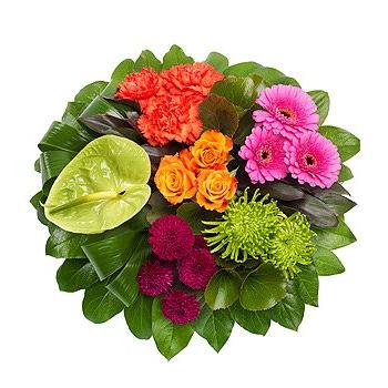 A stunning vibrant posy pad. An orange Rose, cerise Germini, green and purple Chrysanthmums, orange Carnations and red Cordyline on a bed of green foliage.Perfect for a family member or friend who was bright and gregarious .