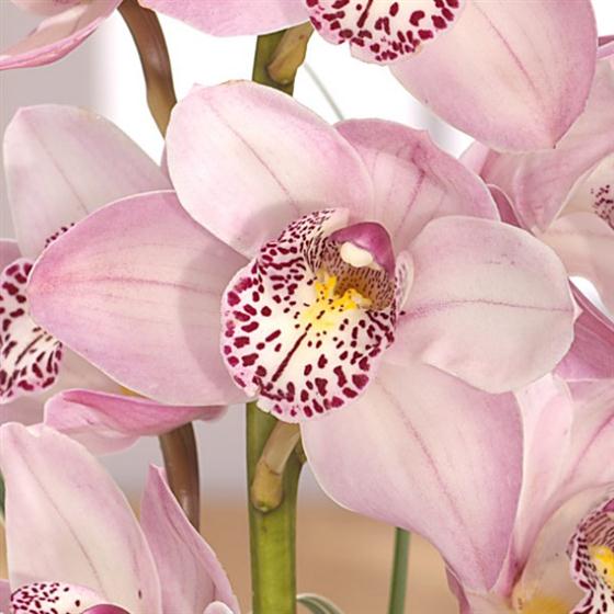 A striking vase arrangement starring pink mini Cymbidium and variegated grass in a contemporary lime green vase.
